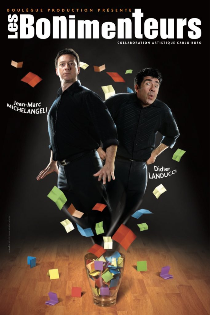 Un spectacle d’humour élégant et populaire, jamais vulgaire, doté d’une structure très précise qui allie écriture et improvisation. Un art difficile que Didier Landucci (Ducci) et Jean-Marc Michelangeli (Marco) manient avec une grande maîtrise, et qui s’est imposé comme la spécialité artistique incontournable de leur prestation scénique. Les péripéties du duo comique Marco et Ducci tissent le fil conducteur du spectacle et encadrent des saynètes improvisées sur des thèmes inventés par le public. C’est grâce à leur étonnante complicité et à leur imagination débordante, qu’ils saisissent la moindre proposition du public complice et facétieux, pour l’entraîner dans des univers démesurément fantaisistes en composant une kyrielle de personnages, traversant les époques, les modes et les registres avec une déconcertante allégresse. Une véritable performance d’acteurs alliée à un concept original qui garantit à chaque représentation un spectacle complètement différent, un nouveau défi à relever !